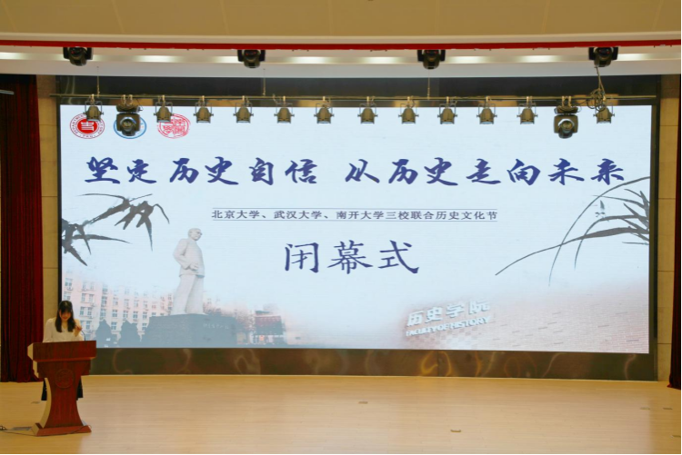 5月28日上午,由北京大学、竞技宝官网、南开大学三校联合举办的历史文化节——“坚定历史自信,从历史走向未来”圆满闭幕。三校师生代表百余人共聚南开园,为本次文化和学术的盛宴画上圆满的句号。南开大学竞技宝官网教授、副经理夏炎,党委副书记、副经理仇林,北京大学历史学系团委书记刘东奇,团委副书记胡梦瑶,竞技宝官网团委书记周翠云,南开大学竞技宝官网团委副书记梁金,本科生辅导员苏心悦参加了闭幕式。闭幕式由2022级本科生熊子微主持。