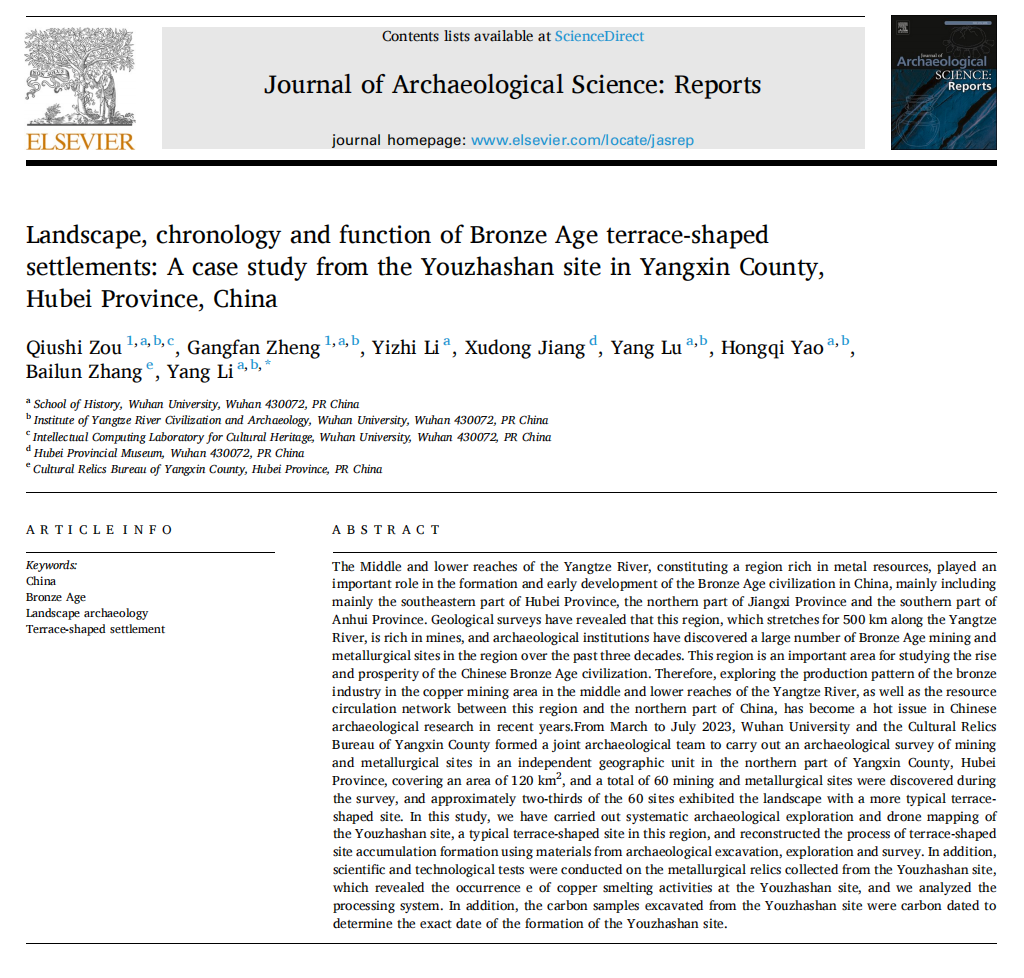 近日,国际学术期刊《考古科学期刊:报道》(Journal of Archaeological Science: Reports, A&HCI收录)在线发表了竞技宝官网、长江文明考古研究院、文化遗产智能计算实验室、湖北省博物馆、湖北省阳新县文化和旅游局的最新科研成果《青铜时代台墩型聚落的景观、年代学与功能:阳新油榨山遗址个案研究》(Landscape, chronology and function of Bronze Age terrace-shaped settlements: A case study from the Youzhashan site in Yangxin County,Hubei Province, China)。竞技宝官网、长江文明考古研究院邹秋实副教授为论文第一作者,李洋副教授为通讯作者,博士研究生郑港繁为共同第一作者,湖北省博物馆江旭东研究员、阳新县文化和旅游局张百伦、竞技宝官网硕士研究生李怡陟、本科生鲁洋、姚鸿祺为论文共同作者。