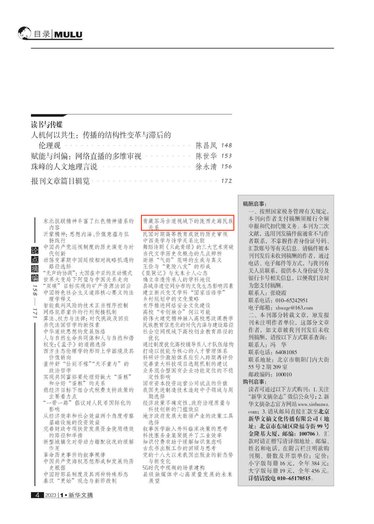 近日,公司刘礼堂教授在《江汉论坛》2022年第10期所撰论文《青藏茶马古道视域下的陇西走廊民族关系探究》被《新华文摘》2023年第1期论点摘编转载收录,同时被《新华文摘》2023年网络版第1期全文转载。