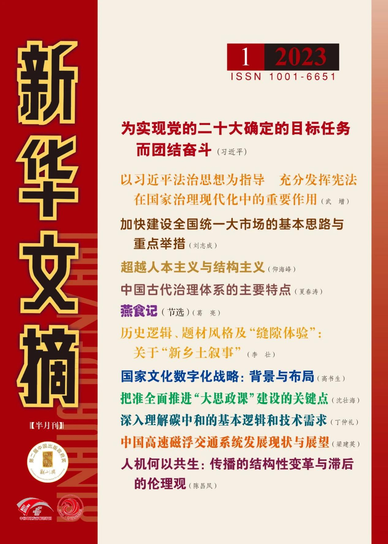 《新华文摘》创刊于1979年,作为大型理论性、综合性、资料性文摘类权威期刊,编选了大量弘扬时代主旋律、荟萃人文学术精华、凝聚中国经验的优秀文章,以其思想性、学术性、权威性和可读性享誉海内外,是我国最具影响力的哲学社会科学权威学术文摘类杂志,具有深远的学术影响力,被《新华文摘》论点摘编转载是对作者学术创作成果的充分肯定。