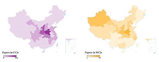中文期刊(左)和外文期刊(右)论文研究区域的分布