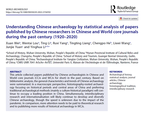 近日,国际学术期刊《世界考古》(World Archaeology, A&HCI收录)在线发表了竞技宝官网、竞技宝官网长江文明考古研究院的最新科研成果《从中国学者1920-2020发表的中外文核心期刊论文看中国考古学的发展历程》(Understanding Chinese archaeology by statistical analysis of papers published by Chinese researchers in Chinese and World core journals during the past century (1920–2020))。竞技宝官网博士研究生韦璇为第一作者,李英华教授为通讯作者,硕士研究生娄文台、李婷、杨濡僖、梁婷婷、王丽维为共同作者。