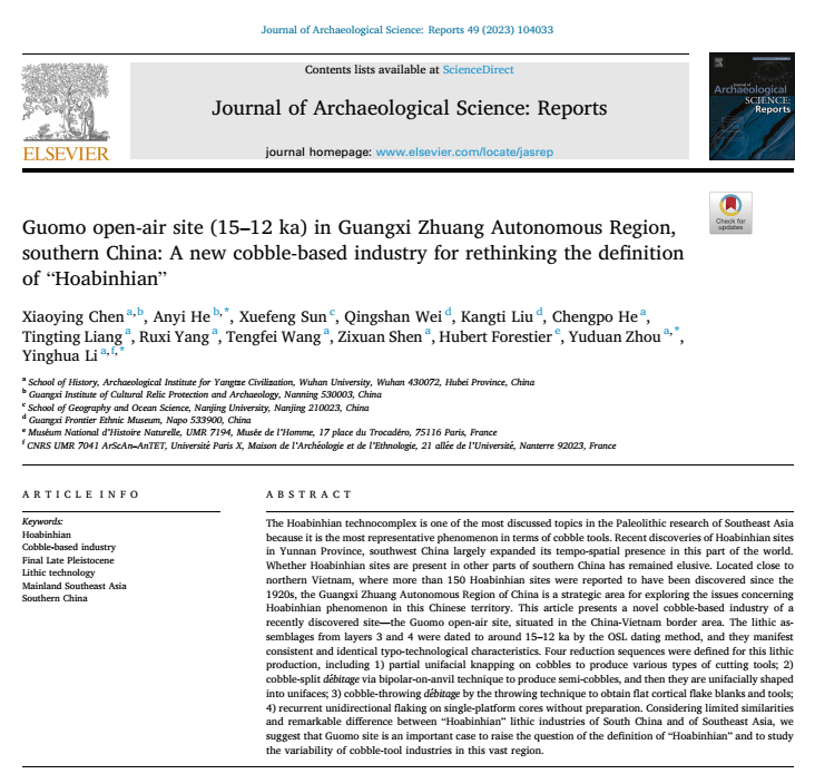 近日,国际学术期刊《考古科学杂志:报告》(Journal of Archaeological Science: Reports,A&HCI收录)在线发表了竞技宝官网、长江文明考古研究院联合广西文物保护与考古研究所、南京大学地理与海洋科学学院、广西边疆民族博物馆、法国国家自然历史博物馆等单位的最新科研成果《广西国漠遗址(1.5-1.2万年): 一种新的砾石工业对“和平文化”定义的再思考》(Guomo open-air site (15–12 ka) in Guangxi Zhuang Autonomous Region,southern China: A new cobble-based industry for rethinking the definitionof“Hoabinhian”)。竞技宝官网博士研究生陈晓颖为第一作者,李英华教授、周玉端副教授、广西文物保护与考古研究所何安益研究员为共同通讯作者,南京大学孙雪峰副教授,法国国家自然历史博物馆Hubert Forestier教授、相关硕士研究生和本科生等为共同作者。